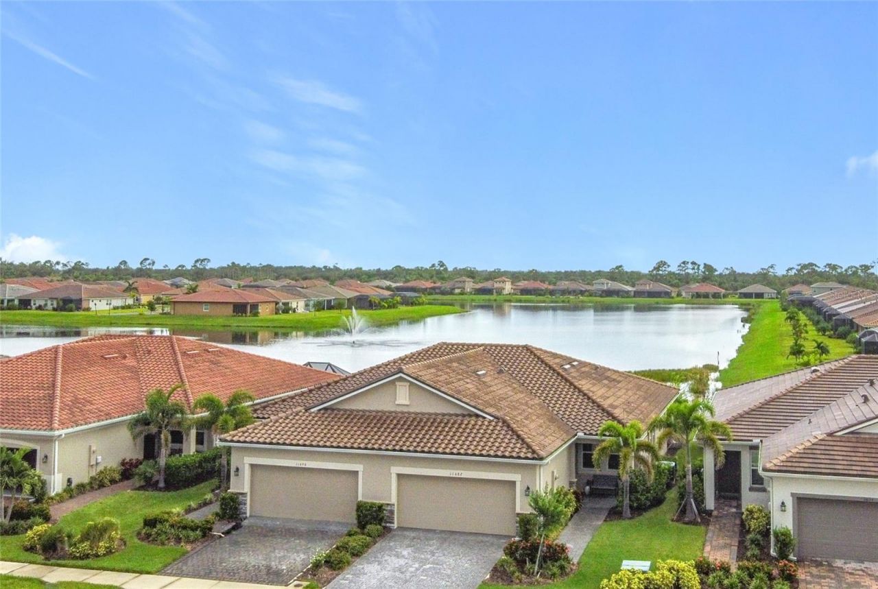EXCEPTIONAL VALUE with UP TO $5,000 BUYER CLOSING COST INCENTIVE offered by seller, for a limited time! Resort-style living, at an improved price! PANORAMIC POND VIEWS from your EXTENDED LANAI in the heart of Wellen Park! Enjoy stunning long-lake views from this beautifully upgraded Largo model villa located in the gated community of Renaissance at Wellen Park. Built in 2022, this move-in-ready, gently lived-in home with FURNISHINGS INCLUDED blends modern finishes, an open floor plan, and a highly sought-after waterfront lot. This maintenance-assisted villa features a decorative paver driveway and walkway, charming front porch, and an inviting glass entry door. Inside, the bright foyer showcases wood-look plank tile flooring, abundant natural light, and a thoughtfully designed open layout. A versatile den / flex room near the entry works perfectly as a home office, third bedroom, or bonus space. The split floor plan provides privacy with a guest bedroom and full bathroom featuring a quartz vanity and tub/shower combination. At the heart of the home are the impressive living area and open-concept kitchen, where you'll find 42-inch cabinets, quartz countertops, stainless steel appliances, recessed lighting, and a sliding glass pocket door leading to the extended screened lanai. Step outside to enjoy peaceful lakefront views, tropical landscaping, and Florida wildlife - ideal for entertaining or relaxing year-round. The primary suite includes a spacious walk-in closet and a spa-inspired en-suite bathroom with dual sinks, tiled walk-in shower, private water closet, and elegant finishes. Additional highlights include a two-car garage with epoxy flooring and utility sink, hurricane shutters, tile roof, and location in Flood Zone X. Residents of Renaissance at Wellen Park enjoy resort-style amenities, including a zero-entry pool with lap lanes, hot tub, fitness center, clubhouse with catering kitchen, outdoor fireplace patio, tennis and pickleball courts, playground, and dog park. The community is just minutes from Downtown Wellen Park dining, shopping, events, and weekly farmers markets, as well as CoolToday Park, the spring training home of the Atlanta Braves. With convenient access to I-75 and Tamiami Trail, this home is close to Venice beaches, historic Downtown Venice, North Port, Costco, and top Southwest Florida attractions. This lakefront villa in Wellen Park offers the perfect blend of location, lifestyle, and low-maintenance living.