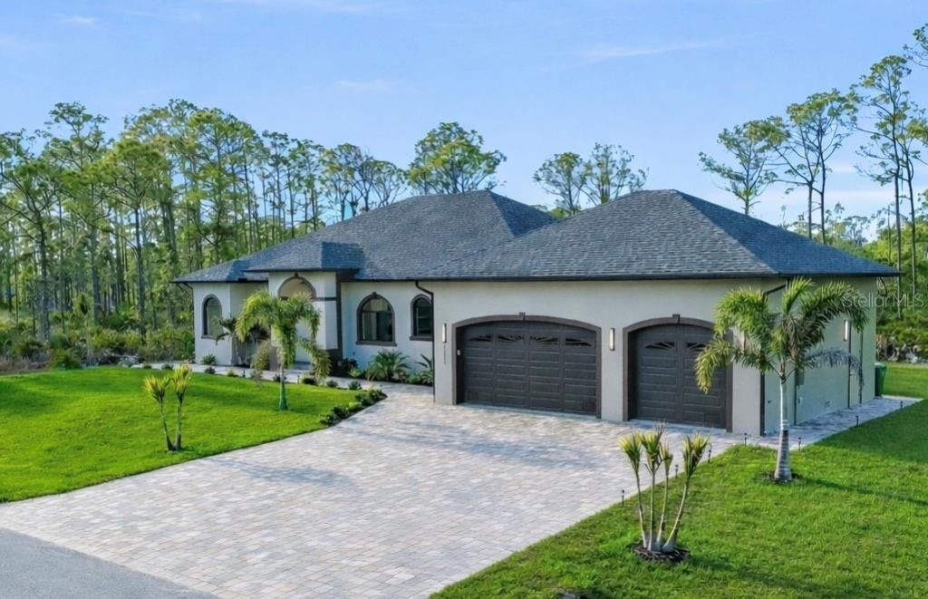 One or more photo(s) has been virtually staged. Set on a rare double lot of nearly half an acre, this exceptional custom-built residence offers the freedom of no HOA and ample space for your lifestyle-whether you need room for an RV, boat, or additional parking, or simply want a generous yard for pets, play, or gardening. Located in a quiet and peaceful neighborhood, the home provides a true sense of privacy while still being just 5-8 minutes from everyday amenities and a short drive to some of the best beaches on the Gulf Coast-delivering the essence of the Florida lifestyle without restrictions.The home is thoughtfully elevated and framed by lush, well-designed landscaping, creating a striking first impression as you approach the double entry doors. Inside, you are welcomed by soaring 12-foot ceilings throughout, elegant tray ceilings, and an abundance of natural light streaming through bright, expansive windows, enhanced by beautiful, thoughtfully selected light fixtures that elevate each space.Designed with both style and function in mind, the interior features warm wood-look tile flooring throughout, detailed crown molding, custom wood trim, and 8-foot doors in every room. The living area is centered around an electric fireplace with a designer tile surround, complemented by custom-built shelving that adds both character and practicality.The chef's kitchen is a true centerpiece, showcasing custom cabinetry, quartz countertops with a full matching backsplash, upgraded appliances, and abundant storage. A spacious walk-in pantry adds convenience, while the separate laundry room offers additional cabinetry and a utility sink. Everyday organization is made easy with a built-in bench and shoe storage area.This home offers 3 bedrooms, a dedicated office, and 3 full bathrooms, all thoughtfully designed with tasteful finishes, glass shower enclosures, and refined decorative touches throughout. Custom closet shelving enhances storage in every space.Step outside to your private retreat-an expansive screened, saltwater heated pool and lanai, offering exceptional privacy and generous space for entertaining or relaxing. The lanai is prepped with outdoor kitchen hookups, making it ideal for creating your dream outdoor living area.Completing the property is an impressive oversized 3-car garage 28ft x 32ft , perfect for car enthusiasts or those needing extra workspace-truly functioning like a car or boat shop. The exterior also features a wide paved driveway and paver walkways on both sides of the home, adding both convenience and accessibility.For added comfort and efficiency, the home is equipped with an reverse-osmosis water filtration system and an extra-large water tank, providing high-quality water throughout.This home seamlessly blends luxury, comfort, and practicality, filled with light, thoughtful design, and refined finishes-offering a true Florida lifestyle without HOA restrictions. Experience it in person to truly appreciate its warmth and beauty-schedule your private showing today.