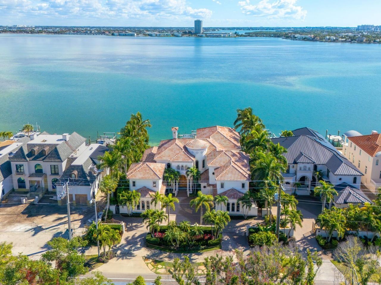 Live your luxury at Casa Lido, a spectacular waterfront estate in the enclave of Lido Shores, offering sweeping, unobstructed views across Sarasota Bay to downtown Sarasota and iconic Ringling Bridge, while having private beach access. This is a rare opportunity to own a residence of extraordinary scale, presence and craftsmanship, where every detail has been custom-designed and executed at the highest level. A private, gated drive leads to a dramatic custom arched wooden double door entry opening to a two-story grand foyer, setting the tone for the home's impressive proportions and architectural sophistication. Soaring ceilings, refined millwork, curated chandeliers and walls of glass frame the open bay views, while electric screens allow you to enjoy uninterrupted vistas throughout the day without sacrificing comfort or privacy. Spanning an exceptional amount of square footage, the residence offers five bedrooms, five full baths, four half baths and a thoughtfully designed layout that balances grandeur with livability. Two dedicated office spaces include a stunning wood-paneled office with a spiral staircase leading to a second-story library, complete with custom bookcases and a charming tucked-away nook, ideal as a child's hideaway or creative retreat. The first-floor primary suite is a sanctuary, featuring oversized dual walk-in closets and a spa-inspired bath designed for effortless daily living. Wake each morning to tranquil water views and the gentle rhythm of the bay. An additional private office adjoining the suite offers an inspiring workspace with panoramic scenery. Designed for entertaining at every scale, the chef's kitchen is anchored by premium appliances, an expansive island, a butler's pantry, dual dishwashers and seamless flow into the family room. Pocketing sliders open to the outdoor living areas, blurring the line between indoors and out. Wellness and leisure are elevated throughout the home, including a private gym with sauna, a temperature-controlled wine room and storage, and a fully equipped entertainment room with theater seating, wet and dry bars, and game space. Upstairs, spacious guest suites enjoy refined finishes and access to wraparound balconies with a gas fireplace. ideal for sunset views over the water. Guests will appreciate the separate guesthouse, featuring a private entrance, living area, kitchenette, dedicated laundry, en-suite bath and serene water views, ideal for extended stays or multigenerational living. Outdoors, the estate continues to impress with upper and lower resort-style pools, a fire pit, outdoor kitchen, and multiple spaces for dining and relaxation. Boating enthusiasts will enjoy direct bay access from the private dock, complete with lifts and accommodations for watercraft and paddleboards. Every space in Casa Lido is oversized, intentional and undeniably grand, a home that must be experienced in person to fully appreciate its scale, finishes and commanding presence. Just minutes from St. Armands Circle, world-class beaches and downtown Sarasota, this is waterfront living without compromise.