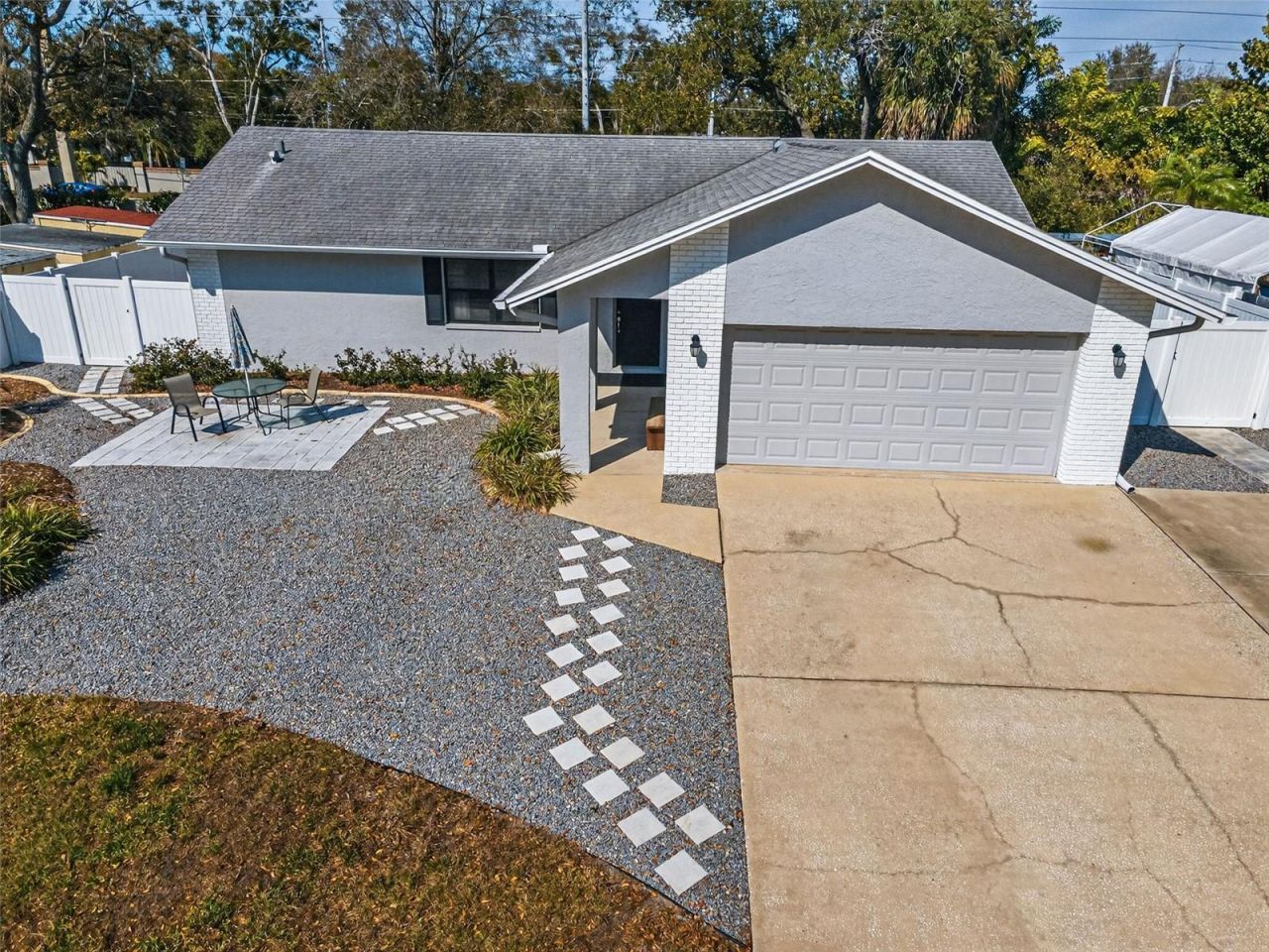This picturesque Palm Harbor home boasts the sweeping curb appeal you'd expect to find in such a sought-after enclave. With 3 bedrooms, 2 full baths, and a 2-car garage, this ranch style/block construction home features a 3-car driveway that borders several tiled walkways: one leads to a spacious concrete patio, another to an inviting covered porch, and the third to a spectacular yard enclosed with a vinyl fence. A custom-built, screened lanai (with hurricane shutters) makes for a true retreat with ample room for dining, relaxing, and even space for your workout equipment. A serving port from the kitchen and a beautiful set of French doors from the formal dining room elevate the space to an entertainment destination for holidays and milestone celebrations. A huge stone patio extends well beyond the lanai's footprint into the yard, reaching along both sides of the home lending tremendous design flexibility to this alfresco haven. There's even the ideal construct to accommodate a cozy firepit. Inside, cathedral ceilings lend drama to the Great Room plan displaying a picture window and set of doors revealing the lanai. This expansive space allows an endless array of furniture configurations. The light and bright eat-in kitchen is well appointed with tons of storage space and a large pantry; the interior laundry room is fitted with newer appliances, plenty of cabinetry, and a utility sink. The split floor plan encompasses all three bedrooms which are carpeted and outfitted with generous closets, while the second bath was COMPLETELY RENOVATED with contemporary stylings. Only a quick drive to the famous Caladesi Island State Park, Honeymoon Island, eclectic Dunedin, Pinellas Trail, (the forty-seven-mile, multi-use pathway that runs from St. Petersburg to Tarpon Springs), and the unparalleled Clearwater Beach -- The Hammocks subdivision in Pinellas County is not in an evacuation zone and benefits from the stellar school district. An assumable VA loan with low interest is available for qualified buyers. This home on Foxcroft Drive has it all!