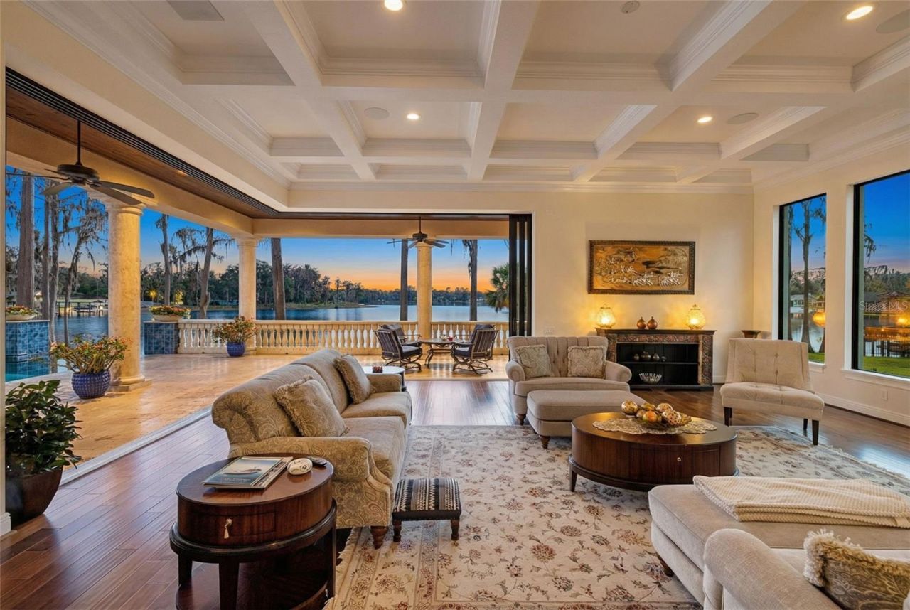 Introducing 17124 Crawley Road, a gated Mediterranean lakefront estate where refined architecture meets resort-caliber living. Set on nearly six acres along the shores of Rainbow Lake, this custom Arthur Rutenberg residence showcases a signature custom floor plan not available to the public, offering six bedrooms, seven full baths, two half baths, and four garage spaces within a double gated private retreat designed for both grand entertaining and everyday luxury. Built in 2017 and encompassing approximately 10,545 total square feet including a detached guest cabana (596 Sq. Ft), the home opens with a dramatic double-door entry and soaring foyer crowned by a sweeping dual staircase. Expansive windows frame tranquil water views and fill the interiors with natural light. The formal living room impresses with 24-foot ceilings, a gas fireplace, and panoramic pool-to-lake vistas, while the family room's pocketing sliders create seamless indoor-outdoor living. At the heart of the home, the designer kitchen blends statement style with function, featuring a Cianitus granite island, Cambria Menai quartz surfaces, gas range, wall oven, pot filler, designer lighting, and an elegant butler's pantry with wine refrigeration. An oversized formal dining room offers a stunning setting for gatherings both intimate and grand. The main-level primary suite is a private sanctuary complete with fireplace, dual custom walk-in closets, and a spa-inspired bath with freestanding soaking tub and oversized shower. Additional ensuite bedrooms, a fitness room, and a soaring study provide flexibility, while upstairs offers oversized guest suites, a sunken game room, bar, and lakefront balcony with pocket sliders elevating the entertaining experience. Designed by Ryan Hughes Design, the outdoor environment rivals a private resort with a heated saltwater pool and spa, covered terrace, full outdoor kitchen, fire pit, and lush landscaping. Paver pathways lead to a private dock installed in 2021, offering direct lake access for boating, sunset cruises, or fishing. A separate one bedroom, one bathroom guest cabana provides ideal accommodations for visitors or multigenerational living. Additional highlights include two two-car garages, EV charging station, dual laundry rooms, custom closets throughout, hurricane-rated windows and sliders (with one shuttered area), surround sound, fruit trees, and intricate crown and tray ceilings. Located in Odessa, one of Tampa Bay's most coveted enclaves known for estate homesites, natural beauty, and privacy, this property offers a rare blend of lakefront living with convenient access to top schools, dining, shopping, major highways, and Tampa International Airport.