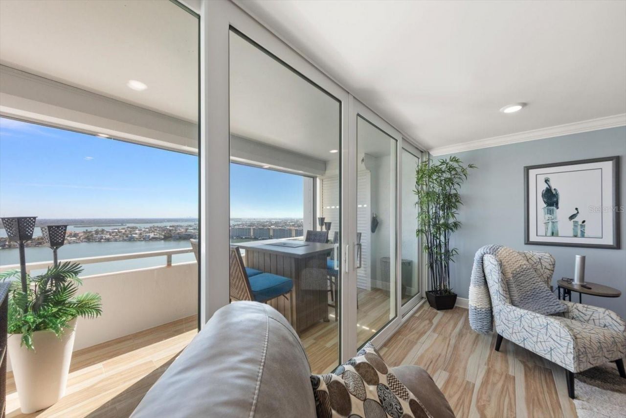 WIDE OPEN WATERVIEWS from the 19th floor of the tallest building in Redington Shores. From its comfortable balcony one can see all the way to downtown St Pete. Recently remodeled with no detail spared. New kitchen with soft close cupboards, pantry closets and stainless-steel appliances. Granite counters flow onto a stylish mid-century backsplash. Soft lighting undercabinet with overhead tray lighting. Kitchen seating for two with ample room behind for a table of six. Expansive views from telescoping hurricane-rated sliding glass doors and windows. Covered balcony with electric shutters. Common areas complete with ceramic plank tile, upgraded baseboards and recessed lighting. Crown molding throughout. Every switch and outlet replaced with one-of-a-kind metal gangers and covers. Both bathrooms modernized to include unique tilework, showers, doors, vanities and tray lighting. From plush carpet in the oversized master bedroom to a modern barn door ensuite with double sinks and walk-in closet, all of which are meticulous. Beautiful built-in plantation shutters in both bedrooms. Sold fully furnished decorator grade right down to the personal photo lengthwise over the sofa of the old Redington Shores Long Pier. Redington Towers provides a heated beach-front pool with 600 feet of frontage on gated grounds. Across the street from Del Bello Nature Park with a fishing dock, boat tie up and covered picnic areas. Mere blocks to the Redington Shores Tennis and Pickleball Court with a small dock behind. The town of Redington Shores offers some of the area's freshest seafood and waterfront dining. Well worth a visit!