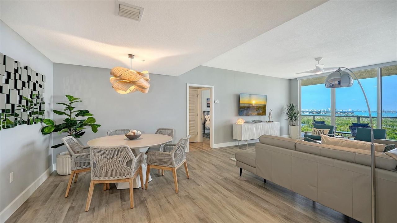 Showcasing breathtaking bay and city skyline views, this impeccably remodeled furnished residence delivers refined coastal elegance and effortless waterfront living. From the moment you enter, panoramic water and skyline vistas take center stage, setting the tone for a light-filled interior designed for both comfort and entertaining. The open floor plan features an inviting living room and dining area with designer lighting and walls of glass opening to the extraordinary 40+ foot terrace, an ideal setting for morning coffee or hosting guests against a stunning waterfront backdrop. The beautifully appointed kitchen blends style and function with custom cabinetry, quartz countertops, under-cabinet lighting, tile backsplash, and a full suite of Bosch appliances including refrigerator with freezer drawer, dishwasher, built-in microwave, oven with warming drawer, electric 5-burner cooktop, and vent hood. A Silhouette Professional dual-zone beverage center completes the space for effortless entertaining. The tranquil primary suite is a private retreat with terrace access, ceiling fan, and a thoughtfully redesigned spa-style bath featuring dual vanities, walk-in shower, and private water closet with Toto toilet and bidet. An office with a Murphy bed offers a closet with barn door enclosure, accent wall, frosted glass double doors, and ceiling fan, while an additional bedroom enjoys terrace access. The guest bath includes a tub/shower combination with Kohler fixtures, and the elegant powder bath showcases marble countertops, textured accent wall, and decorative lighting. A separate laundry room with built-in cabinetry adds everyday convenience. The chic powder bath is perfectly positioned for guests. Outdoor living is exceptional on the expansive terrace, complete with patio furnishings and a Coyote electric grill. Additional features include a hallway trash chute, new water heater (2022), assigned gated under-building parking space, and private storage locker. Located within the prestigious L'Elegance on Lido Key, residents enjoy a secure gated beachfront community with guard service, direct beach access, heated lap pool, spa, children's pool, fitness center with saunas, tennis courts, kayak and bike storage, social rooms, underground parking, and full-time maintenance staff. Extensive building enhancements are underway including renovated common areas, brand-new elevators nearing completion, and a new roof in 2025. Assessments are fully paid and reserves are funded. With city beach re-nourishment underway, this is a rare opportunity to enjoy turnkey coastal luxury in one of Sarasota's premier beachfront communities, where every day feels like a private resort escape.