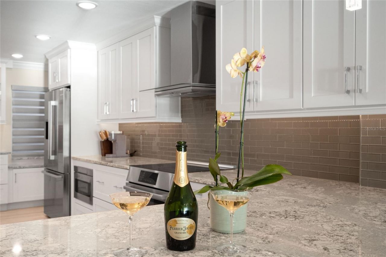 Sleek. Contemporary. Timeless elegance-with breathtaking views.Welcome to Whispering Sands, Unit #1105.This exquisite residence showcases thoughtfully curated finishes throughout, blending refined design with effortless coastal living. Crown molding, recessed lighting, and ceiling fans are just a few of the elegant details that set the tone. Offered turn-key and beautifully furnished with pieces from Bernhardt, Crate & Barrel, and more, this home is truly move-in ready.The cook's kitchen is nothing short of divine and designed for entertaining. Stunning Cambria quartz countertops are complemented by an impressive 8-foot waterfall breakfast bar. Abundant graceful cabinetry features soft-close doors and drawers throughout. The premium BOSCH stainless-steel appliance suite includes a refrigerator, range, dishwasher, built-in drawer microwave, and a 32-bottle wine refrigerator.Wide-plank tile flooring flows seamlessly throughout the home, creating an expansive, cohesive, and airy feel. The dining and living areas are ideal for everything from an intimate weeknight dinner and movie to larger gatherings with family and friends.Floor-to-ceiling impact glass sliders in both the living room and primary bedroom frame stunning views of the beach and the Gulf-and those unforgettable sunsets. Hunter Douglas motorized, light-filtering shades allow you to tailor the ambiance to suit your mood.The primary suite rivals a luxury hotel, offering sweeping Gulf views right from the bed. The spa-inspired bath is beautifully appointed with dual sinks, a vanity, abundant storage, a rainfall shower with built-in bench, and striking tile work-your own private sanctuary. The guest bedroom provides a welcoming retreat for visitors, conveniently located near a private guest bath.This gracious home delivers beauty, sophistication, and timeless design-just steps from a private beach, swimming pools, clubhouse, Tower Lounge, and the charm of Siesta Village.