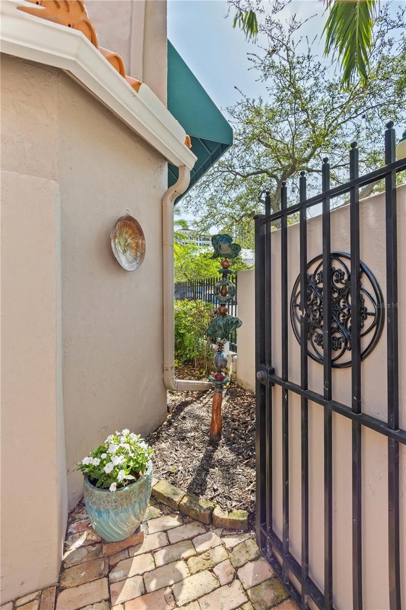 Enjoy the best of both worlds at Library Mews with both downtown convenience and walkability as well as lush expansive private outdoor areas. Library Mews is an intimate community with only 11 residences featuring 2-story villas with masonry construction and private garages. The exterior of the entire community was updated in 2025, with new roofs, awnings, exterior paint, gutters, exterior lighting, and hurricane impact skylights. The interior of this residence has been extensively remodeled, increasing ceiling heights, improving the kitchen and bathrooms, and adding a second A/C system that facilitates two separate heating/cooling zones, one for each level. The island kitchen boasts a sub-zero refrigerator, Cambria quartz countertops, mother-of-pearl backsplash, and wood, dovetailed all-drawer cabinetry that includes a pull our spice rack and built-in trash receptacle. The range is a Bosch electric smooth top, however, it can easily be swapped out for a gas range using the existing gas bib. And the adjacent butler's pantry/laundry room has loads of extra storage. The living room, dining room, and kitchen all have glass sliders that bring the outside in and provide easy access to the private courtyard area. The courtyard has gas service, facilitating a direct connect BBQ grill thereby avoiding having to lug propane tanks. The first floor includes a convenient den with custom built-in mahogany shelving and desk and loads of storage space. A powder room completes the first floor. The owners' suite is light and bright with triple sliders and brazilian cherry hardwood flooring. The walk-in closet has been custom fitted and is easily reconfigurable to your needs. The ensuite bathroom includes a dual quartz vanity, under mount sinks, Toto commode with electric outlet access, a skylight, a deep soaking bathtub, and spacious walk-in frameless shower with seat. The fixtures are Hans-Grohe and include swivel vanity taps and a handheld shower head that can operate together with the main shower head or separately. The guest suite is split from the owners' suite and includes an ensuite bathroom with skylight and a spacious closet, making hosting guests a pleasure. In addition to the attached one-car garage, this residence also includes a carport providing total space for two vehicles within the gated area. The garage has a separate air-conditioned storage closet. And electric hurricane shutters make storm preparation a breeze. Top it all off with an expansive rooftop private terrace with new 24 porcelain pavers that is perfect for enjoying your morning coffee or a glass of wine in the evening. You'll not only be able to catch some rays, but also indulge your green thumb, and watch the fireworks over the bay. In a city that's largely dominated by high-rise condominiums, Library Mews is a world apart. Blending into the surrounding landscape, it truly is an oasis hidden in plain sight. Tucked into a quiet corner of the city away from the fray, Library Mews is convenient to all of the downtown amenities. Just two blocks to Whole Foods and Starbucks, across the street from Selby Library, the Opera House, and Florida Studio Theater, Library Mews is only a few minutes walk to Main Street restaurants and shops, the Saturday morning Farmers Market, as well as the Bayfront.