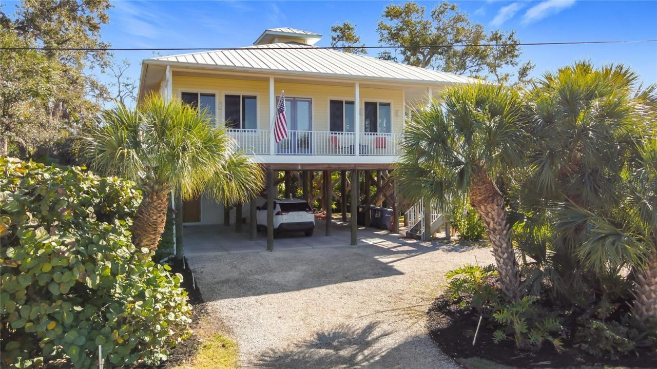 Envision yourself in this custom-built Southern Design pilling home that is located on a saltwater canal with direct access to the intracoastal waterway and the Gulf of America/Mexico. This elevated coastal residence offers peaceful water views of the intracoastal waterway and Lemon Bay, exceptional boating access, and a true Florida waterfront lifestyle. This open floor plan features 2 bedrooms and 2 bathrooms, with the great room and dining area highlighted by coffered ceilings and abundant natural light. Impact-rated windows and French doors enhance the bright, airy coastal atmosphere. While the doors are not impact-rated, they are equipped with shutters for storm protection. Both bedrooms and the main living areas display beautiful water views, creating a serene setting throughout the home. The open kitchen contains granite countertops and appliances, including a GE refrigerator, GE Profile microwave, Kenmore oven/range, and Whirlpool dishwasher. A separate laundry room includes a Whirlpool washer and dryer. The Jack-and-Jill primary bathroom offers convenient access from both bedrooms, and the home includes three storage closets with built-in shelving for added functionality. Outdoor living is a true highlight. A wraparound front and side porch provides the perfect place to relax and take in sweeping water views. The property also features a private walkway leading to a 4' x 10' dock. Additional exterior features include professional landscaping, an irrigation system, an outdoor shower, and an Insta-Hot electric water heater. The elevated design allows for covered parking for up to four vehicles, along with a storage room and a circular driveway for easy vehicle entry and exit. Home was designed to add an elevator if needed.Located directly across the street from a public park with boat ramps and direct Intracoastal access, this home is also just minutes from Dearborn Street, known for its dining, shopping, and local events. Immaculately maintained inside and out, this waterfront home offers an exceptional opportunity to enjoy coastal Florida living, combining boating convenience, walkable amenities, and tranquil water views in one desirable Englewood location.