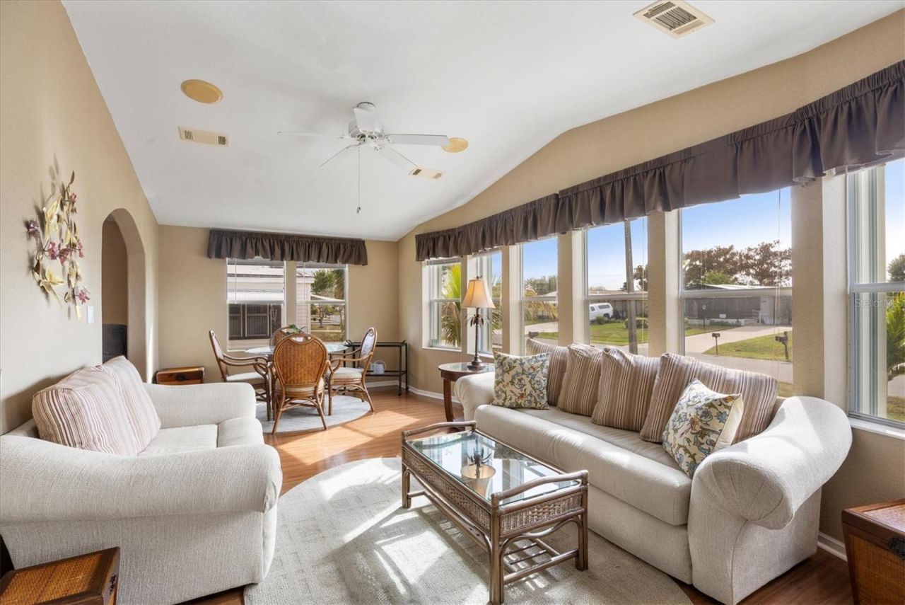 Land owned, golf cart and pet friendly living in the 55+ community of Holiday Mobile Estates. This two bedroom, two bathroom manufactured home is being sold fully furnished and offers peace of mind with an X flood zone for the structure, 2022 roof, 2024 A/C, and accordion shutters on the front windows. A spacious carport with attached shed provides convenient storage and functionality. Inside, the living room features a wall of windows that fills the space with natural light and creates an open, welcoming feel. Vinyl flooring throughout the main living areas and kitchen makes everyday maintenance easy. The large kitchen offers an abundance of cabinets and counter space, along with an adjoining breakfast nook for casual meals. Vaulted ceilings give the space an open, comfortable feel. Just off the kitchen is a generous family room with large windows and plenty of room for entertaining. When it is time to wind down, both bedrooms are nicely sized. Double doors lead to the primary bedroom with a walk-in closet and an ensuite bathroom featuring a dual sink vanity and walk-in shower. The guest bedroom offers two separate reach-in closets, and the guest bathroom includes a tub and shower combination with a skylight. An interior laundry room adds convenience with built-in cabinets and shelving. Through the rear door or from the carport, you will find a glass enclosed, all-weather Florida room where you can enjoy the outdoors without concern for rain or pests, along with access to the attached storage shed. The backyard is a good size with single row privacy fencing that adds a bit of separation and privacy. This land owned location has no required monthly maintenance fees. Membership to the Edgewater Club is optional and available for a low yearly fee, providing access to a wide range of amenities and activities including a heated swimming pool, tennis and shuffleboard courts, pickleball, horseshoes, a boat ramp, and a small dock. The clubhouse hosts an active social calendar with poolside music and sing-alongs, monthly dinners, bi-monthly Sunday breakfasts, and many other gatherings throughout the year. Outside the community, you will enjoy easy access to beaches, shopping, dining, medical facilities, tiki bars, parks, golf courses, and more. Whether you are retiring or looking for a winter getaway, this is a place to enjoy the Florida lifestyle at 2730 Tanager Lane.