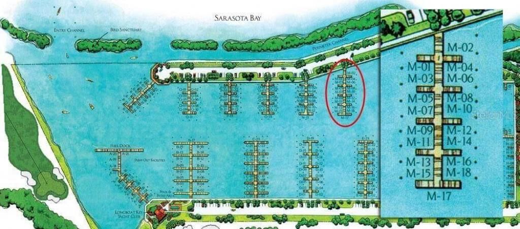 Directions: Longboat Key; Gulf of Mexico Drive to Bay Isles Parkway, thru the guard gate, turn right, then second left. Each dock is marked with a letter sign. M-dock is on the left. Slip M-03 is on the north side of the pier.