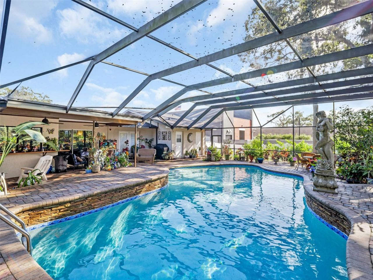 One or more photo(s) has been virtually staged. One of the most unique, SECLUDED, & versatile properties in Pinellas County, this PRIVATE ESTATE offers an exceptional combination of space, privacy, upgrades, & flexibility that is nearly impossible to find in one property. Situated on OVER HALF AN ACRE in desirable Palm Harbor, this 2,795 sq. ft. home is tucked discreetly off Alternate 19, creating a HIDDEN OASIS while remaining just moments from major thoroughfares, shopping, dining, & everyday conveniences. Surrounded by established businesses yet set back for remarkable seclusion, the property offers a rare blend of accessibility & tranquility.The fenced grounds are professionally landscaped and enhanced with outdoor lighting, an updated sprinkler system (2025), expansive green space, and a shed complete with electricity. Enjoy Florida living at its finest with a custom, RESORT-LIKE 10' DEEP POOL beneath a massive, screened enclosure, plus a convenient 2-car carport & generous on-site parking capacity-a unique feature that adds to the property's overall versatility.Inside, the home features FOUR spacious bedrooms, THREE full bathrooms, and multiple living areas designed for comfort and adaptability. The flowing layout includes a formal living room, a cozy family room with a beautiful wood-burning fireplace just off the kitchen, and an oversized bonus room currently used as an office that could easily function as an in-law suite, large recreation room, studio, additional living quarters, or expansive workspace. The primary suite is a true retreat with dual walk-in closets and a spacious bathroom featuring a separate makeup vanity, dual sinks, walk-in shower, jetted soaking tub, private water closet, and French doors leading directly to the screened lanai and pool. The primary suite also includes its own dedicated AC unit and water heater for added comfort and efficiency. All kitchen appliances are less than five years old.MAJOR SYSTEM UPDATES provide peace of mind, including a brand-new roof (2025), new fence (2025), new luxury vinyl plank flooring (2024), updated sprinkler system (2025), new septic tank and drain field (2025), two AC units both less than five years old, and an Eaton Type 2 SPD whole-home surge protection system. Located in a non-evacuation and non-flood zone and having never flooded, this property offers rare security along with its exceptional flexibility. The home is also zoned for the highly regarded Ozona Elementary, Palm Harbor Middle, & Palm Harbor University High School (PHU), adding to its long-term value & appeal for buyers seeking access to some of Palm Harbor's most sought-after public schools.With RU ZONING and ample parking capacity, the property may also present an outstanding opportunity for certain BUSINESS BASED or PROFESSIONAL USES, subject to county approval. Its discreet yet accessible location could appeal to buyers seeking space for a professional office, creative studio, health related businesses, therapy space, real estate or consulting office, B&B or a live/work configuration that blends business and residential use seamlessly. The setting provides privacy for clients while maintaining immediate access to Alt 19, creating a compelling option for entrepreneurs seeking a unique and adaptable environment.At $779,000, this is far more than a traditional home - it is a PRIVATE COMPOUND offering lifestyle, space, top-tier school zoning, and potential that is extraordinarily difficult to replicate in today's Palm Harbor market.