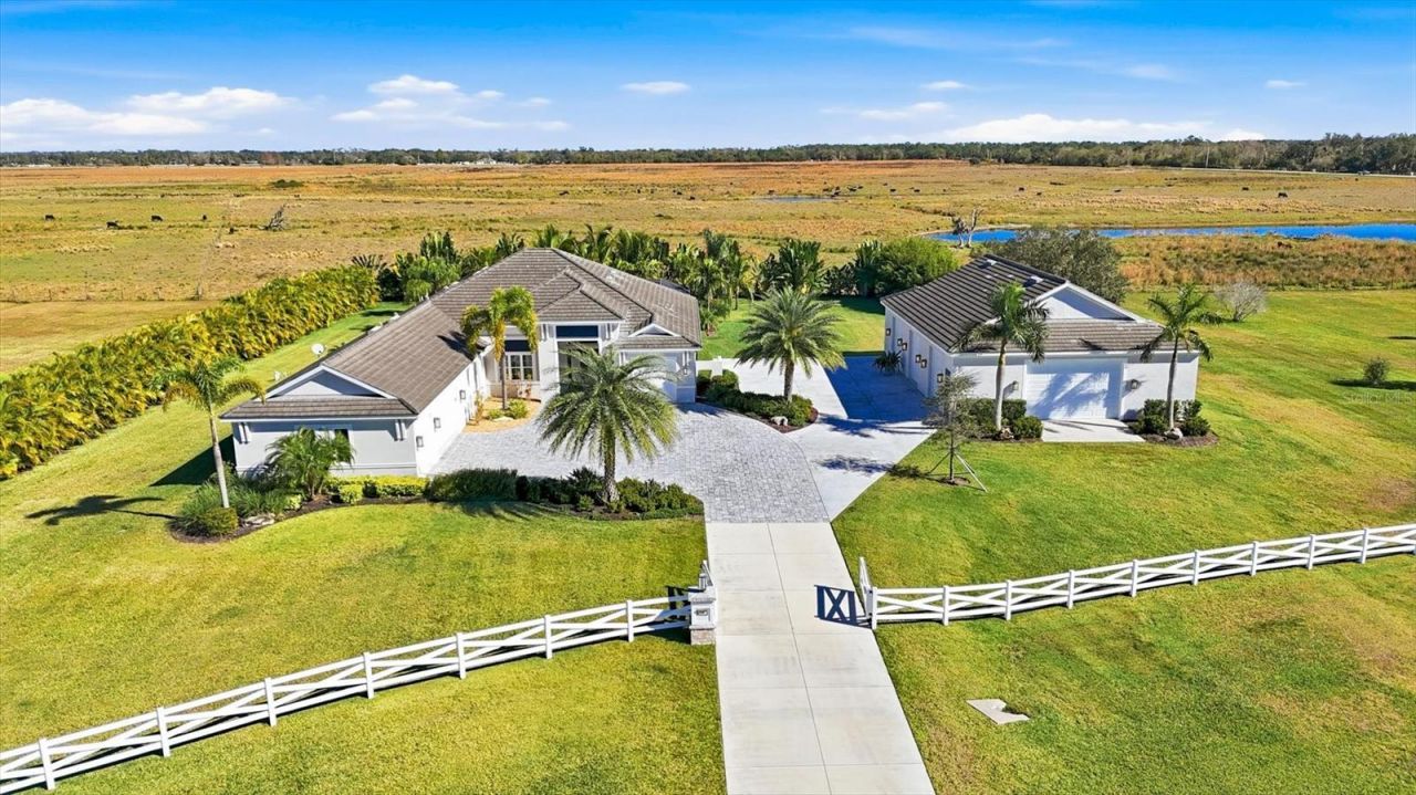 An Irreplaceable Estate Offering Unmatched Value and Distinction...A truly rare opportunity, this exceptional coastal-inspired estate-complete with a substantial detached shop-cannot be replicated at this price point. Built by Medallion Home in 2019 and set within the desirable Hampton Lakes subdivision, the residence is a masterful expression of refined luxury, craftsmanship, and serene country elegance.Spanning more than 3,400 square feet, the main residence is gracefully positioned on just over 3.5 acres, surrounded by sweeping pastoral views that create a sense of privacy and tranquility rarely found so close to modern conveniences. From the moment you arrive, the pavered drive and striking double glass-door entry set the tone for the sophistication within. The interior is rich in architectural detail, featuring custom ceilings, bespoke woodwork, coffered and tray ceilings, and wide-plank blonde beachwood-style tile flooring throughout. Sunlight pours into the home, illuminating thoughtfully designed spaces where modern elegance meets relaxed coastal charm. The chef's kitchen is both stunning and functional, offering a generous island, expansive breakfast bar, stainless steel appliances, double ovens, and a vented hood, all designed for effortless entertaining. Adjacent to the kitchen, the dining nook is framed by an aquarium-style glass window overlooking the screened pool, crowned by a striking beachgrass chandelier that adds warmth and character. Multiple living and dining areas provide versatility for both intimate gatherings and grand entertaining. A spacious bonus room with tray ceilings and corner sliding glass doors opens directly to the pool, seamlessly blending indoor and outdoor living. The formal dining room is enhanced with refined coastal detailing, ideal for elegant evenings at home. The primary suite is a private retreat, highlighted by wood beam accents, shiplap, and board-and-batten design elements. The spa-inspired ensuite features dual vanities, a luxurious walk-in shower, and premium finishes, while the custom walk-in closet offers exceptional storage and organization. Two additional guest bedrooms, a butler's pantry, and a show-stopping oversized laundry room-with abundant cabinetry, folding space, and a dedicated work desk-further elevate the home's functionality. Outdoors, the screened swimming pool is surrounded by lush tropical landscaping, offering a secluded oasis complete with a sun shelf, water features, and LED lighting. Covered lounging and expansive entertaining areas provide the perfect backdrop for alfresco dining and relaxed coastal living. Completing this extraordinary property is a 2,400-square-foot detached garage and shop, featuring decorative epoxy flooring, six electric garage doors with 10-foot openings, and generous space for vehicles, hobbies, or storage. Just minutes from Lakewood Ranch Main Street, downtown Sarasota, and world-renowned Gulf Coast beaches, this remarkable estate delivers an unparalleled blend of privacy, luxury, and convenience. An offering of this caliber is truly exceptional-schedule your private showing and experience the lifestyle that awaits.