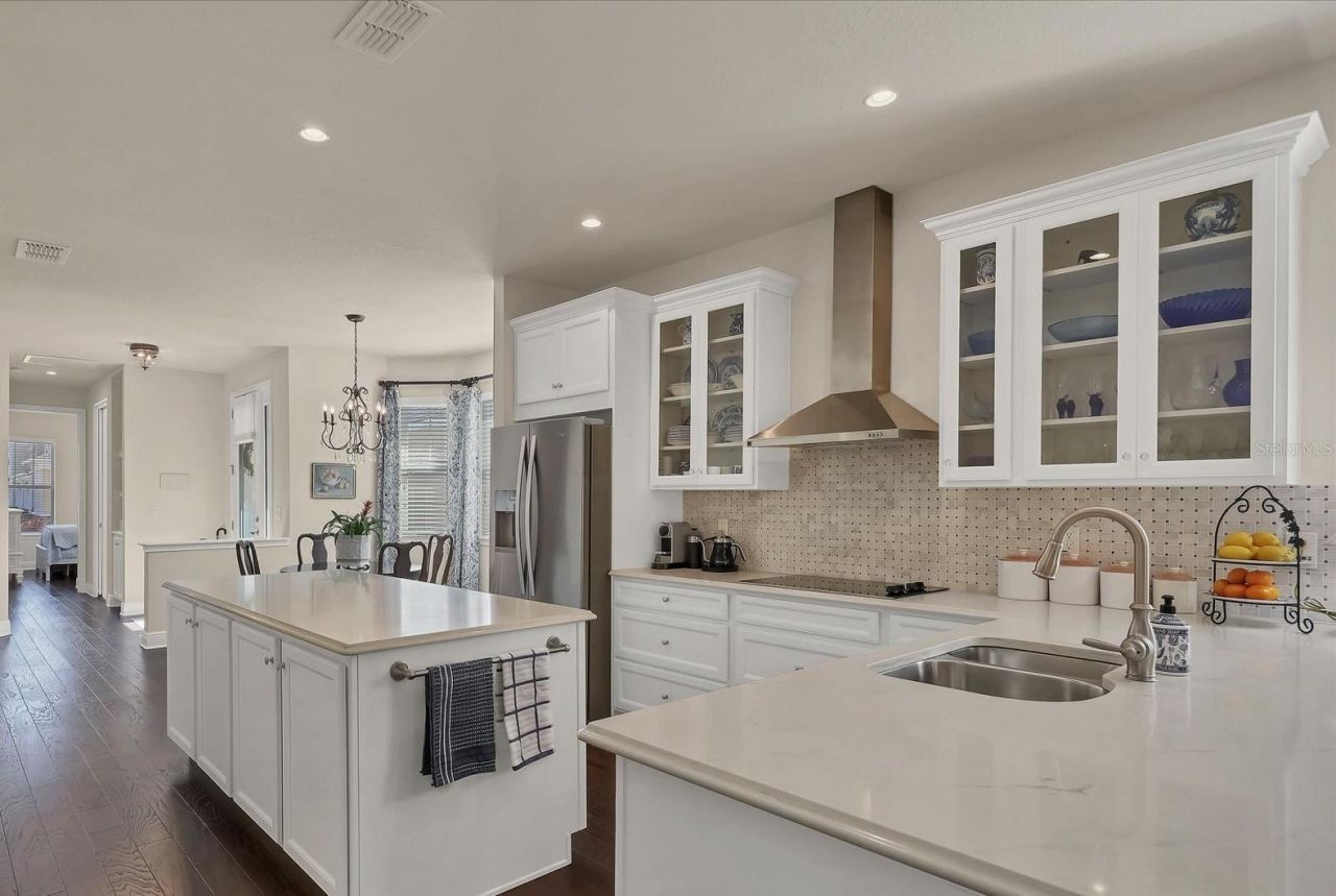 A beautiful, rare corner-unit, single-story residence in the gated Enclave at Forest Lakes, ideally located in the heart of Sarasota. This meticulously maintained home offers privacy, natural light, and an open layout designed for effortless living, all just minutes from Siesta Key Beach, downtown Sarasota, major highways, shopping, dining, and everyday conveniences.Featuring 2 bedrooms, a dedicated office/den with double French doors, and 2 bathrooms, the home showcases over $60,000 in builder upgrades. Interior highlights include 9-foot ceilings, 8-foot paneled doors, rich hardwood flooring throughout, and stylish tile in both bathrooms. The chef's kitchen is a standout with light cabinetry, pull-out storage features, quartz countertops, a large island with a breakfast bar, stainless steel appliances, and a marble backsplash.The primary suite serves as a private retreat with a tray ceiling and a spa-like bath offering a walk-in shower, dual sinks, quartz counters, and ample storage. The great room opens to a full-width covered and screened lanai with remote-controlled fans and ceiling speakers, creating an ideal indoor-outdoor living space.Residents enjoy maintenance-free living with access to a heated resort-style pool, pavilion, dog park, and nearby Legacy Trail access. This corner-unit home combines luxury, privacy, and a central Sarasota location that puts beaches, culture, recreation, and shopping all within easy reach.