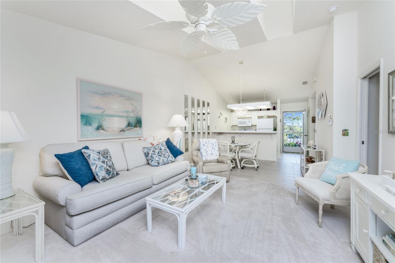 Don't wait any longer - you saw how long the last one was on the market! If a private natural view is on your list of must have's, then this FULLY FURNISHED TURNKEY SECOND floor condo at Golden Tee, an Over 55 Condo community, is perfect, as it backs onto Wildflower Preserve, with a second Environmental Park at the end of the quiet dead end street. The main living area features a high vaulted ceiling, with two skylights, allowing for so much light to shine in! There are sliding glass doors opening on to the lanai, so the park is visible from the kitchen, dining and living areas! The kitchen has sufficient cabinetry and countertop space, and comes with a full appliance package: Frigidaire refrigerator, GE smooth top stove (just 3 yrs old) and microwave,, and Whirlpool dishwasher. The breakfast bar is a handy place for morning coffee, or just to sit and chat while the cook whips up a delicious dinner! Updated carpet in the living room and primary bedroom will feel good on your feet on those chilly mornings! The primary bedroom features a ceiling fan, walk in closet, en suite bath, and another set of sliding glass doors to the lanai, The primary bath has a nice step in shower w/door, vanity and plank tiled flooring. The Guest bedroom has carpeted flooring, ceiling fan, and wall closet, and the adjacent Guest bath features a combo tub/shower and tiled flooring. The laundry closet houses a full size washer and dryer.(brand new washer!) The vinyl enclosed lanai means this space is usable year round, and the screens and vinyls have all been recently repaired. The rear exposure allows for you to sit on the lanai in the afternoon, without the sun blazing in. Both the Metal roof and AC system were replaced in 2021. Pricing allows for you to update whatever you choose and still have a reasonably priced home! The amenities include: heated pool, tennis/pickleball courts, and clubhouse. This condo association has maintained consistently low association fees and is professionally managed.