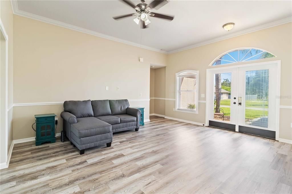 Be sure to be one of the first to see this great deal in the highly desirable South Venice area. Don't miss your chance to own this Beautiful 3 bedroom 2 bath with an additional under air FLEX SPACE (Perfect for a home office, man cave or craft room alike) home situated on a 100' WIDE CORNER LOT. Walking through the double door entrance, you can't help but notice the custom trim work found throughout the main living areas such as crown molding, chair railing, wainscoting and even the windows and doors are completely cased out. Check out those gorgeous luxury plank floors flowing to a well appointed kitchen with a huge pantry and ample amounts of counter and cabinet space. This home features a split floor plan with 2 sizeable guest bedrooms to the left and a large primary bedroom off to the right. The primary ensuite complete with a large walk in closet, showcases a newly renovated shower with subway tile and an updated vanity. Through the sliding glass doors you will find a great sized lanai that has an additional set of sliders allowing you the option and utility of year round usage. Off the lanai is where the additional flex room is located. Things to know before you go: New Roof 2023, A/C 2017, Brand New Never Used Water System, and Brand New Exterior Paint (Accessible Beige). This home is priced to sell, so don't let your South Venice Area Dream Home become someone else's address. Setup your showing today!