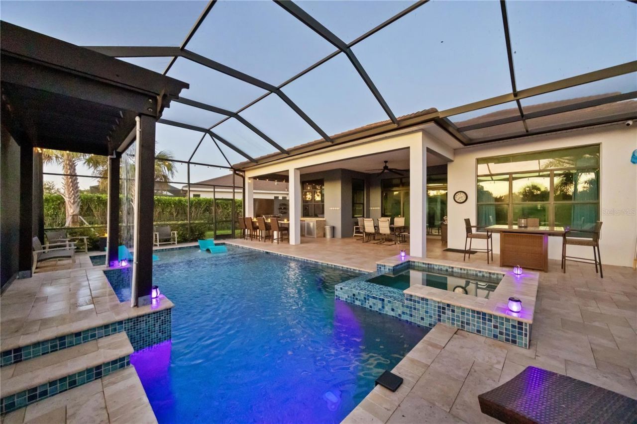 One or more photo(s) has been virtually staged. Don't miss this opportunity to own a premier luxury home in the completely sold-out and highly sought-after Artistry of Sarasota. This exquisite 4-bedroom, 5-bathroom home with a private den offers the perfect blend of upscale finishes, thoughtful design, and resort-style living. Designed for both entertaining and everyday comfort, the open-concept layout showcases a stunning chef's kitchen featuring quartz countertops, custom white shaker cabinetry, a massive center island with sink and bar seating, GE Monogram ovens, a gas cooktop, and new refrigerator and dishwasher. A cozy dining nook and an expansive great room flow seamlessly from the kitchen, while a formal dining area is enhanced by a custom built-in bar with wine storage, creating a perfect atmosphere for gatherings. The first-floor primary suite is a luxurious retreat, featuring double custom walk-in closets, an abundance of natural light, and a spa-inspired bathroom with dual vanities, an additional walk-in closet, and a spacious walk-in shower. Upstairs, three private guest suites each include en-suite bathrooms and walk-in closets, all centered around a generous bonus room perfect for media, games, or additional entertaining space. Step outside to a true outdoor oasis. The saltwater pool and spa feature elegant waterfall water elements and are surrounded by travertine tile and a panoramic picture window screen enclosure. The fully equipped outdoor kitchen with bar seating and a covered lounge area makes this the ultimate space for entertaining or relaxing with family and friends. The backyard is fully fenced, making it perfect for families with small children and pets to play safely. This home also includes a whole house generator, universal car charger, and mini-split in the garage-all less than a year old-plus a newly installed pool heater. High-impact windows and doors, including a hurricane-rated 6-panel glass front door, add safety and style, while Icynene spray foam insulation and gas appliances provide energy efficiency and peace of mind. Interior upgrades include a built-in Sonos sound system with speakers in the living room and lanai, newly sealed driveway and lanai, a barnwood accent wall in the living room, plantation shutters, ultra-modern stainless steel stair railings, and contemporary fans and lighting. The home has been freshly painted inside and out and features all tile flooring on the main level, along with professionally curated design elements such as a kitchen accent wall and a stylish indoor bar. The home is configured with three separate guest suites for optimal privacy and comfort. Located in a gated, maintenance-free community, Artistry offers exceptional amenities including a resort-style pool, clubhouse, pickleball and basketball courts, playground, and scenic walking trails. No CDD fees. This home is high and dry, not located in a flood zone, and just minutes from world-class shopping, dining, beaches, and cultural attractions. With its unbeatable location, model-quality finishes, and resort-style outdoor living, this home is truly the best buy in Artistry-and it won't last long.